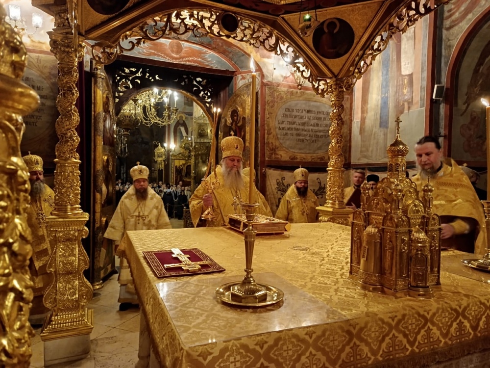 Заупокойную Литургию в Успенском соборе монастыря совершил сонм архипастырей и духовенства.